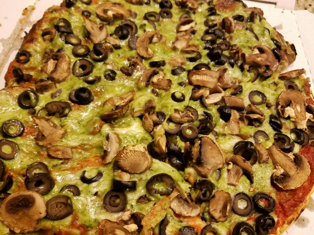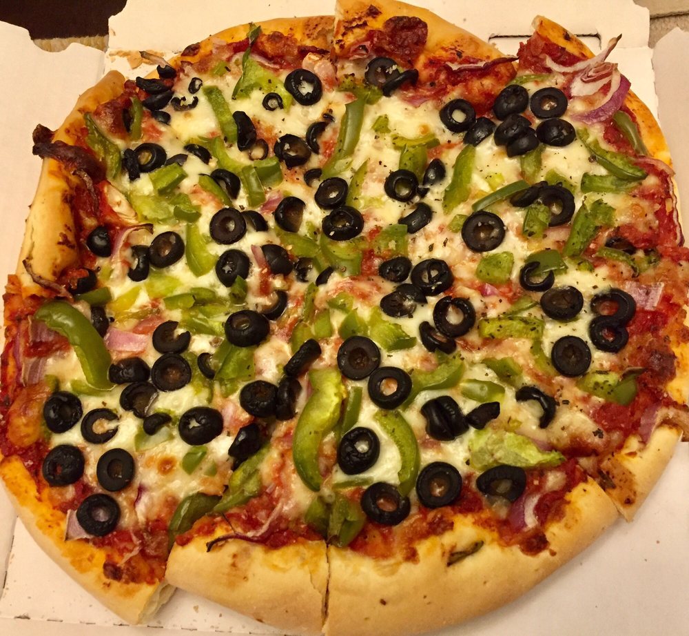 Cheese, sausage, fresh mushrooms, green peppers and black olives. 4 toppings for the price of 3!